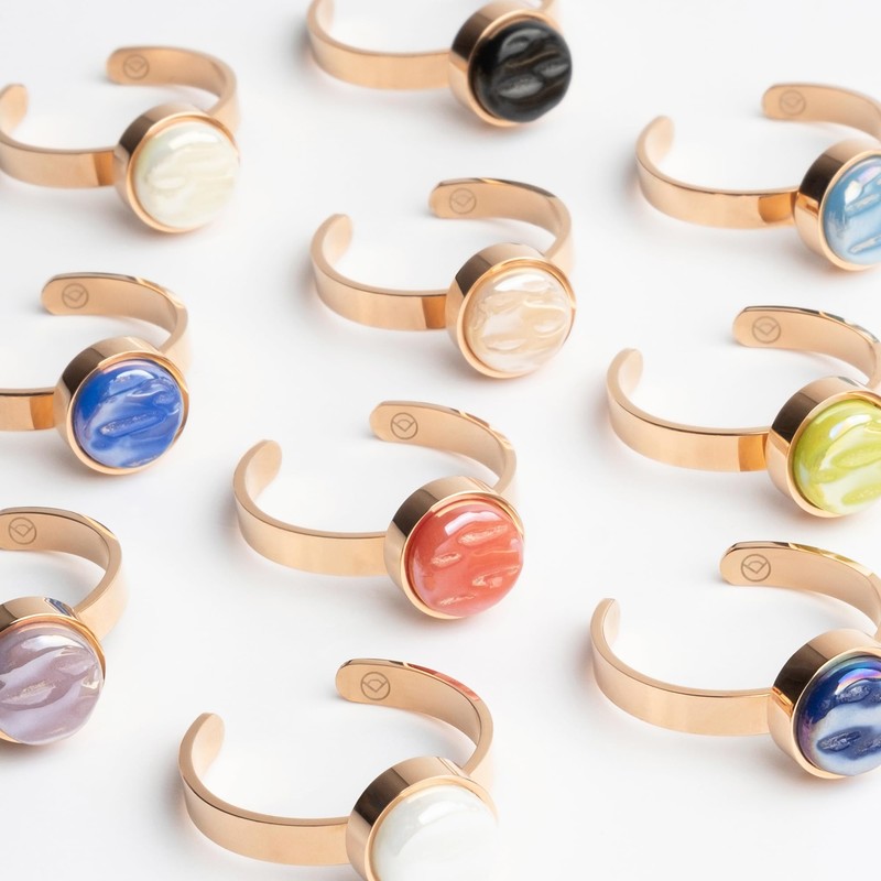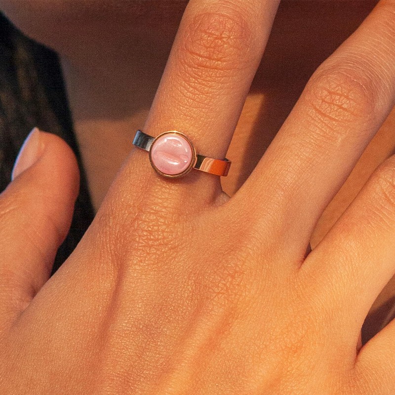 Roségold Ring mit Stein in rosa • Offener Edelstahlring • 18k vergoldeter Edelstahl & recyceltes Glas • nachhaltiger Halbedelstein-Look • größenverstellbar (min. Ø 16 mm)