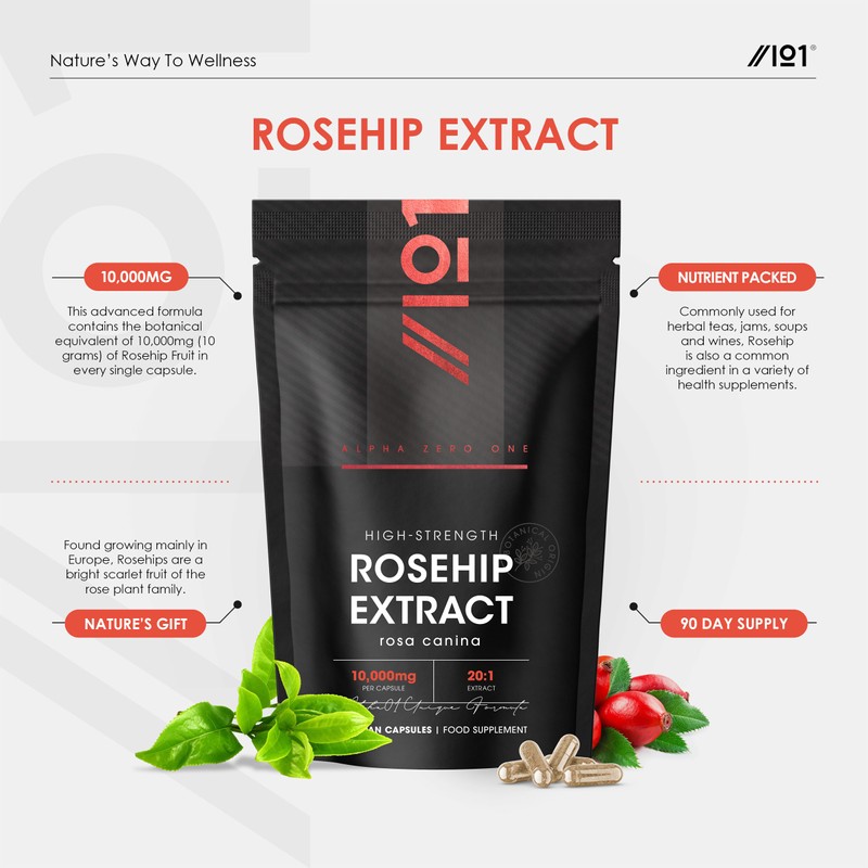 Rosehip Extract 10,000mg - High Strength 20:1 Extract Rosa Canina Supplement – 90 Vegan Capsules (3 Months Supply) – Resealable and Recyclable Pouch by Alpha01