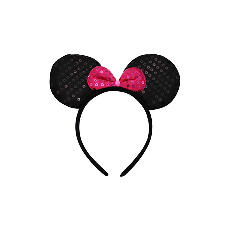- Whimsical fashion hair accessory with sequined black mouse ears and colorful bow