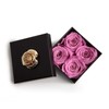 The rose arrangement includes four small eternal roses in pink, which are permanently fixed in a gift box. Overall, the gift item has a height of 2.5 cm and a length width of 6 cm. The diameter of the flowers is 2 to 3 cm.