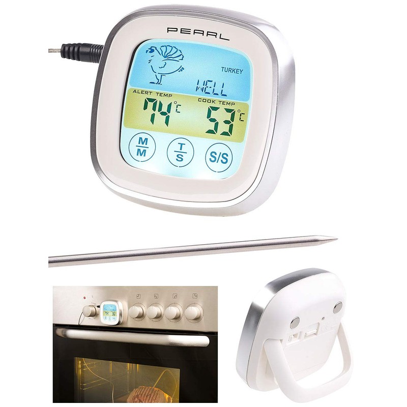 - Practical set of 4 oven thermometers with timer function Individual setting of the target temperature possible Illuminated LCD touch display with display of temperature, target settings, meat type Temperature sensor made of stainless steel, length of probe: approx. 18 cm, heat-resistant wire cable with approx. 100 cm length 2 magnets on the back of the display for hanging on metal surfaces