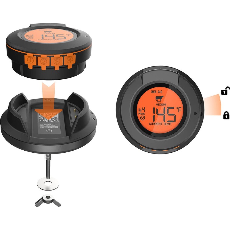• Replaces existing analogue thermometer in the grill lid. Settings for perfect grilling of 9 types of food. 4 sensors for measuring the core temperature, with sensor for cooking chamber temperature. Free app for easy control and grill alarm on the smartphone. Bluetooth for wireless connection to the mobile device up to 50 m away. Weatherproof according to IP65
