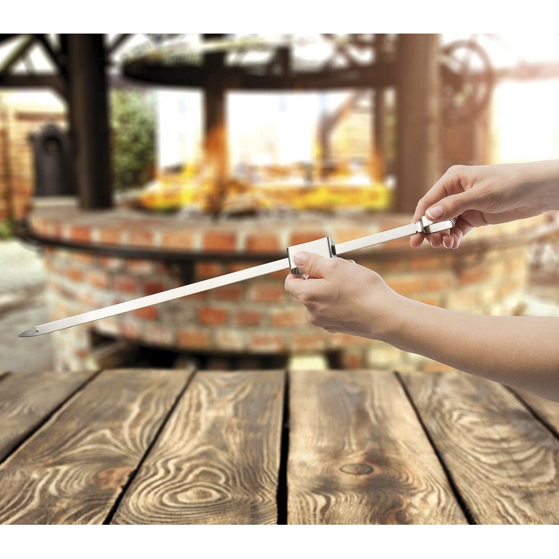 • Keeps your food safe and does not slip. Also ideal for large portions of meat, vegetables, seafood, etc. With practical sliding mechanism for easy serving. Special stainless steel handle: does not get hot. Dishwasher safe and rustproof. Flattened, sharp tip for easy skewering
