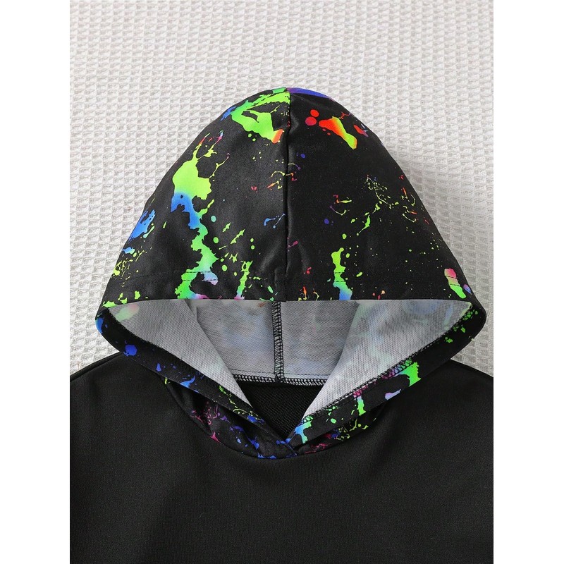 - Features: Reflective, splash ink print, graphic print, hooded neck, 2 piece, hoodie with sweatpants, kangaroo pocket, drop shoulder, loose fit, long sleeve.