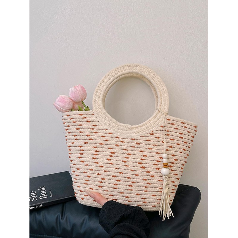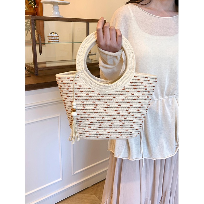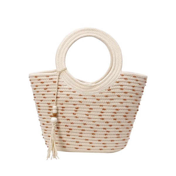 - Features: Summer beach bag for women, double round handle, beaded, tassel trim, cute