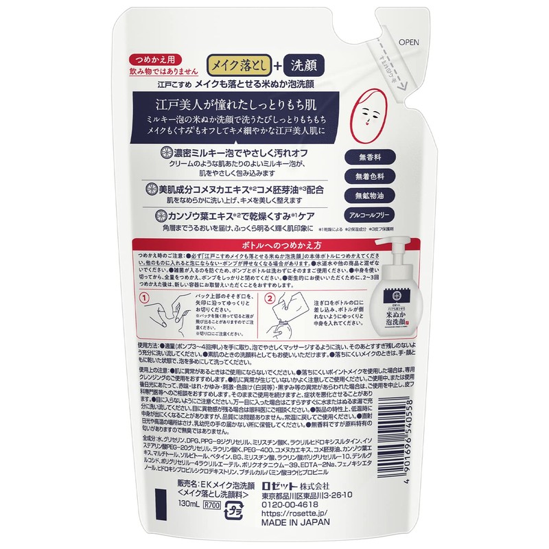 - [For moist and mochi skin] Edokumi Rice Bran Foam Face Washer that removes makeup" is a foam facial cleanser that removes makeup from the ancient Japanese rice bran that has been used since the Edo period. The dense milky foam gently removes makeup and dirt, giving it a delicate and bright shine that leads to a moist skin. Easy to use pump foamer refill (* Komenuka extract (moisturizing ingredient), coconut germ oil (skin protection agent))