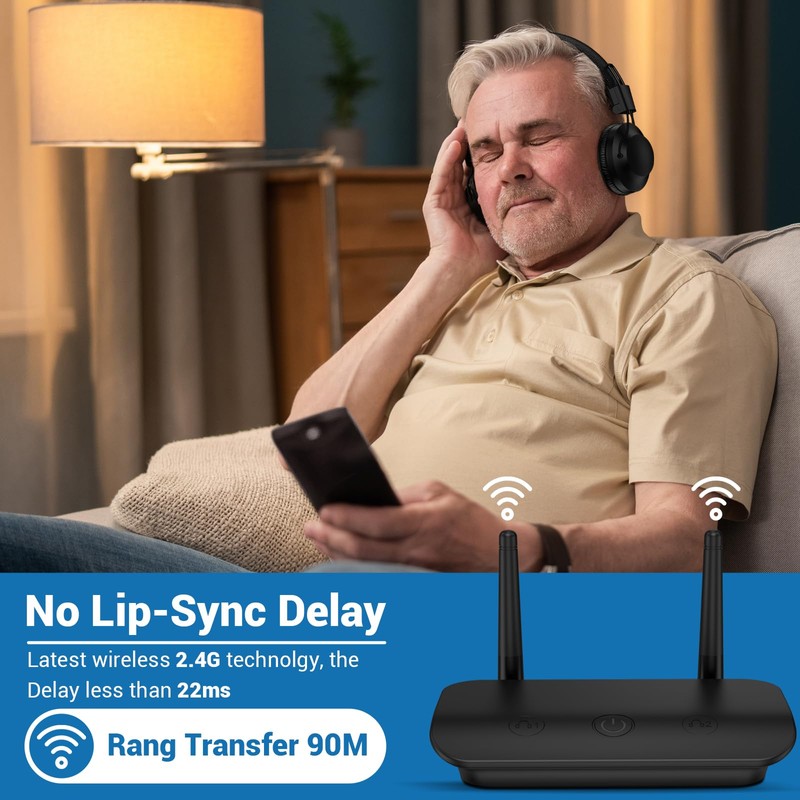 • 2-in-1 Transmitting: The ROSIDA wireless TV set contains with two pairs of headphones. This headphones is the first TV headphones that can be paired with TV and phone at the same time. You can enjoy the TV and also receive call notification at the same time, which means you won't miss any important calls. When your partner use his headphone to be talking on work, which not disturbs you enjoying your TV show with your headphones.