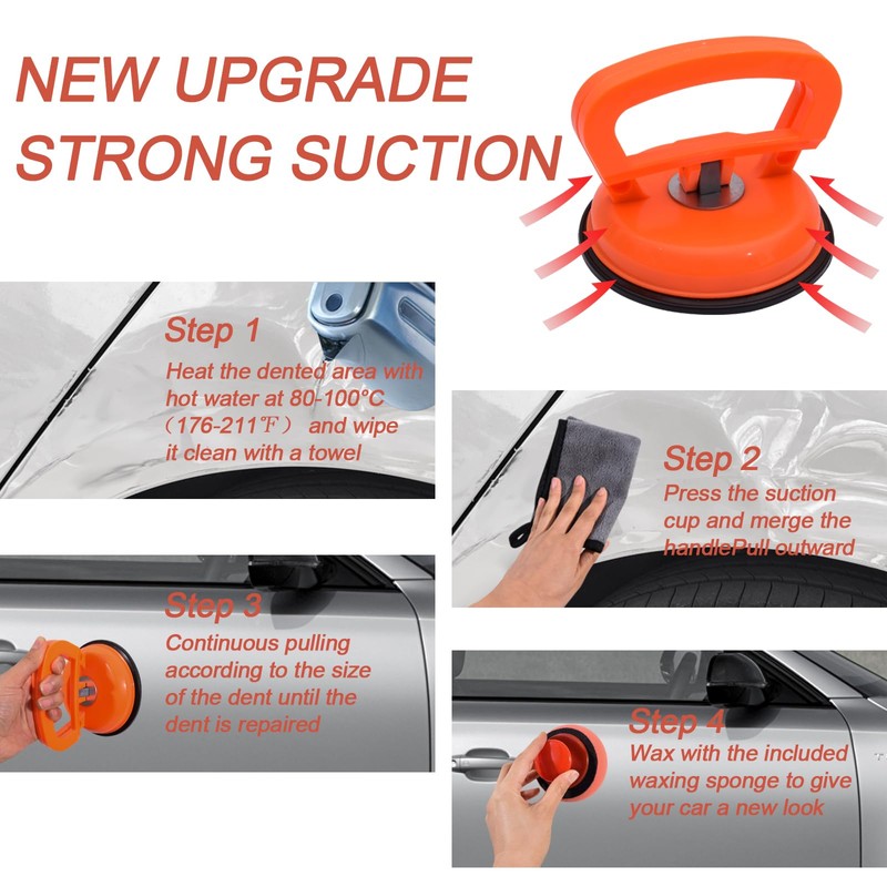 - Easy-to-Follow Repair Process:Heat the dented area with hot water, wipe it dry with the included towel, position the suction puller, and steadily pull until the dent is reduced. Complete the process by applying wax with the provided sponge for a smooth finish. No heating is required for effective suction, making the process quick and convenient