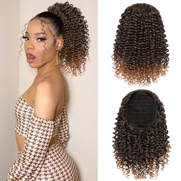 rosmile Short Kinky Curly Ponytail Extension for Black Women, 10 Inch Natural Black Mix Brown Drawstring Curly Ponytail with Two Clips, Synthetic Afro Drawstring Ponytail for Black Women