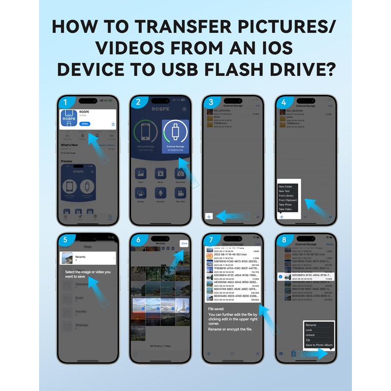 - Compact & Convenient: This MFi-Certified 256GB iphone photo storage stick helps you solve storage issues on your iPhone/iPad/PC, allowing you to easily back up your photos, videos, and phonebook with just one click using the app USB drive. (Note: To use this iphone memory stick on an iPhone/iPad, please download and install the "ROSPE" app from the App Store. For Android phones, simply enable the OTG function, no need to download any additional apps.)