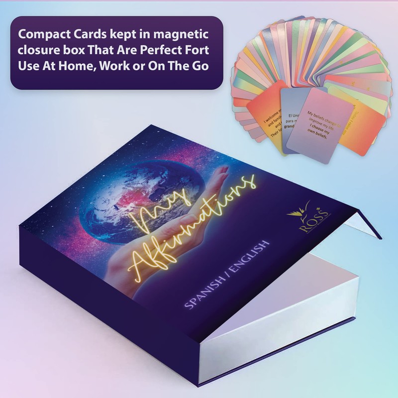 - [BEAUTIFUL DESIGN] – These 50 durable high-quality affirmation cards feature unique encouraging, uplifting affirmation quotes in Spanish on front and English on back with golden printed letters in both versions. These daily affirmation cards will brighten your mood and are kept in a magnetic closure box that is also an ideal gift for your loved ones.