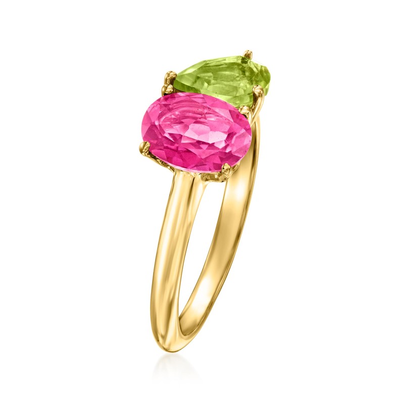 Ross-Simons 1.60 Carat Pink Topaz and .90 Carat Peridot Toi Et Moi Ring in 18kt Gold Over Sterling. Size 9