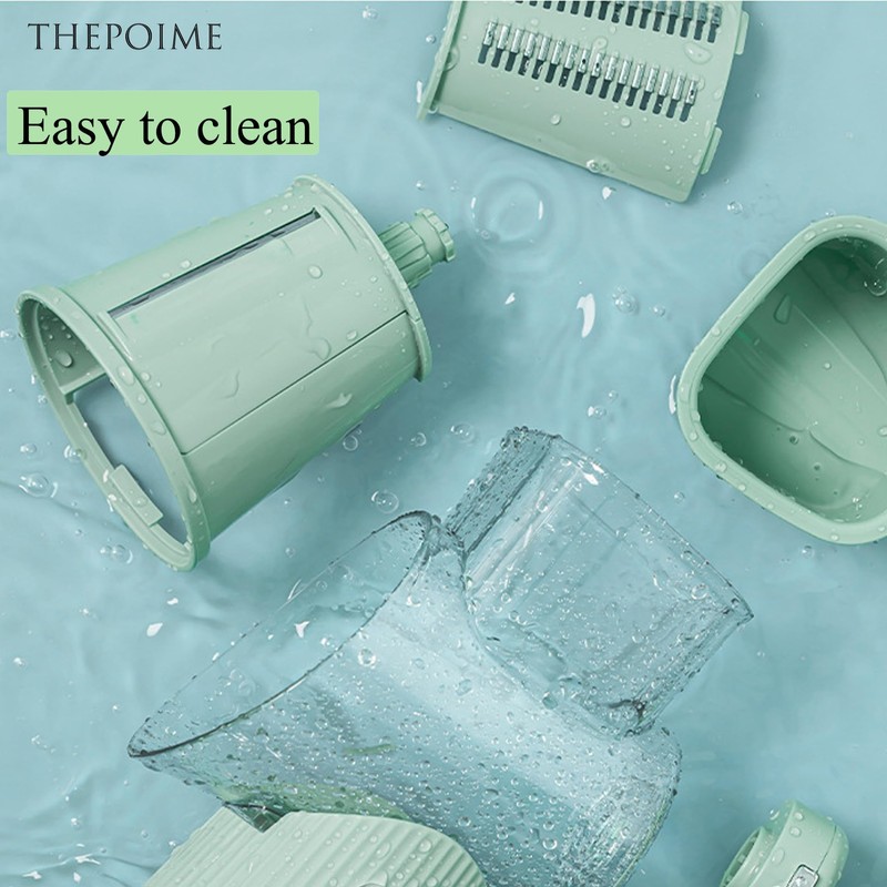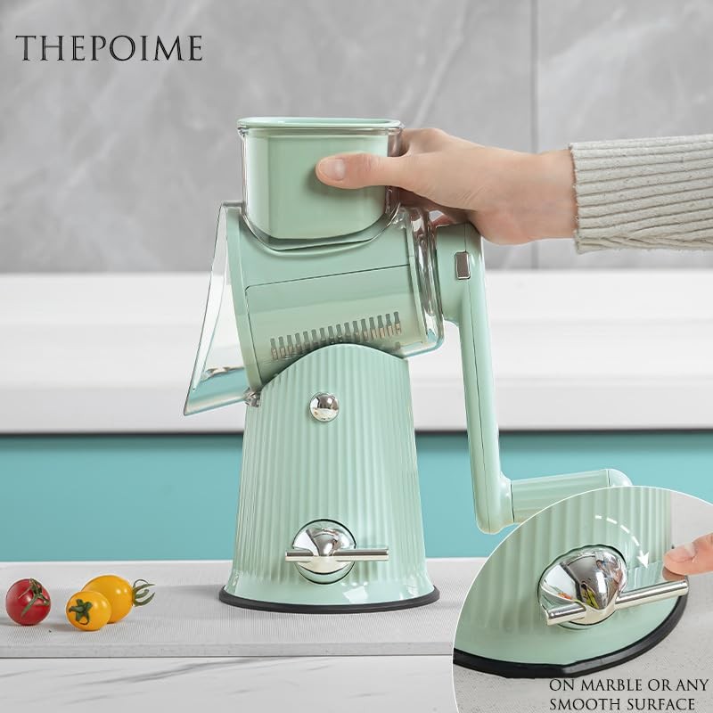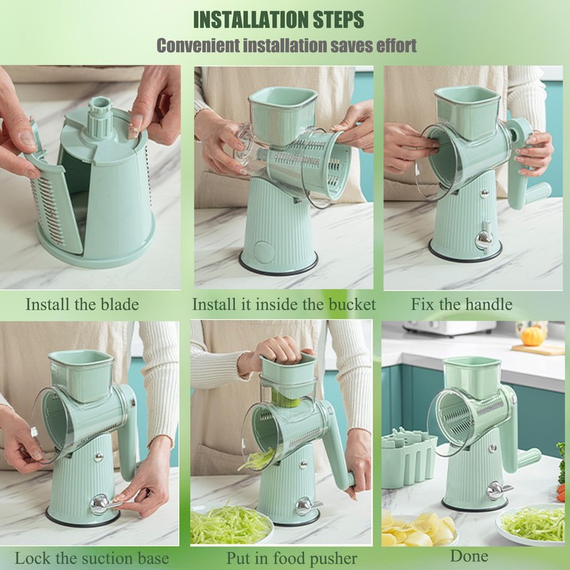 - Safety & Stability Redefined: Built-in suction base locks onto countertops for wobble-free operation, even on marble surfaces. Ergonomic crank handle and protective food thruster keep fingers away from blades, eliminating injury risks of traditional graters.