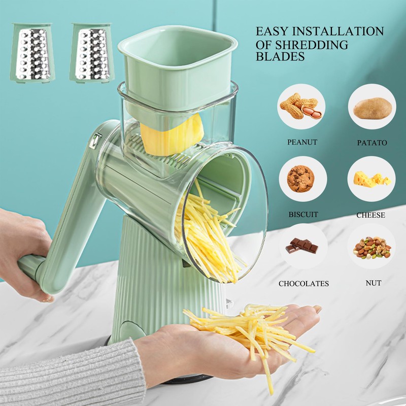- 5-in-1 Multi-Functional Design: Equipped with 5 stainless steel blades (thin slicing, coarse shredding, wave cutting, grinding, and fine grating), this rotary grater handles cheese, vegetables, nuts, chocolate, and even butter with precision. From Parmesan to zucchini, transform ingredients into restaurant-quality textures in seconds—12x faster than manual cutting.
