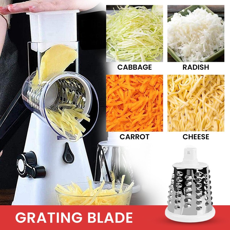 - For All Your Kitchen Chopping, Grating Needs: Our handheld cheese grater is a 3 in 1 multifunctional grater, rotary cheese grater with 3 rotary blades for slicing, shredding, and grating fruits and vegetables. It features a slicing blade, shredding blade, and grating blade, giving you various options for food prep in one convenient tool. It is a perfect option as food graters for kitchen with handle, carrot grater, rotary vegetable grater, cabbage grater or rotating cheese grater.