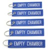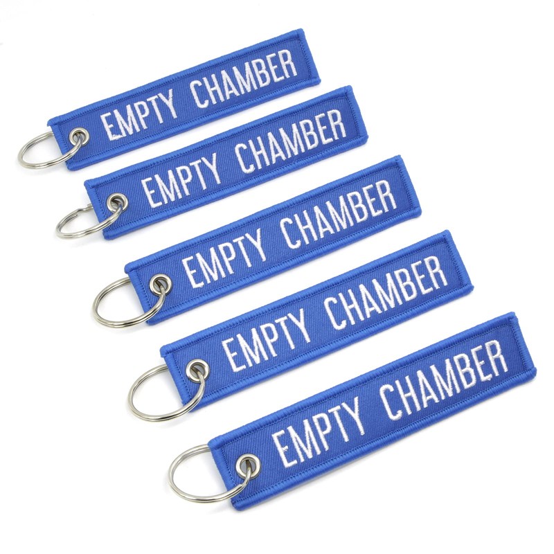 Our EMPTY CHAMBER Keychains are 100% embroidered, with merrowed borders.
