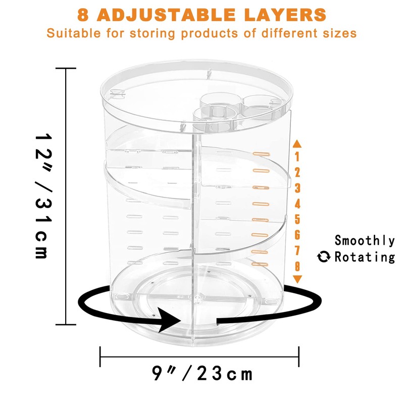 Rotating Makeup Organizer, DIY 8 Adjustable Layers Spinning Skincare Organizer, Cosmetic Display Case with Brush Holder Perfume Tray, Multi-Function Storage Carousel for Vanity Bathroom Countertop