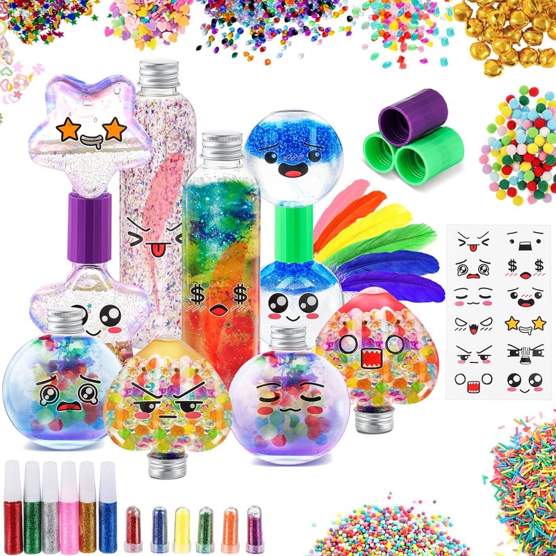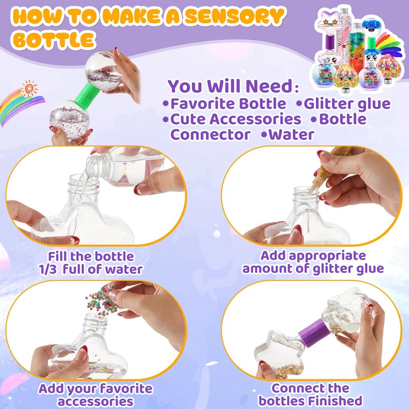 - DIY Your Own Sensory Bottle: exploring the world of sensory play and build your own water sensory bottle; Calm down bottles kits include 10 bottles, 5 shapes of sensory bottles, 2 each; It also comes with sequins, glitter glue, glitter powder, feathers, stickers, colorful pom poms and more