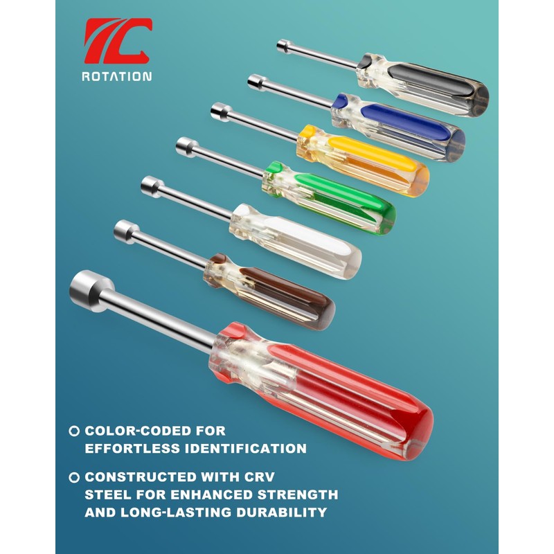 ROTATION 7PC Metric Nut Driver Set - 5-12mm Hex Drivers for Bolts Nuts Fasteners, Color-Coded Non-Slip PVC Grips