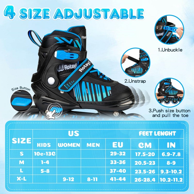 - ADJUSTABLE INLINE SKATES: Rotayi inline skates for adult and kids have four different sizes, Small(10C-13C) for small kids, Medium(1-4) for big kids, Large(5-8) for youth, X-Large for Adult Women(9-12) / Men(8-11). Please choose the right size by checking the size chart before purchasing. With a touch of the size button, you can adjust it to fit your foot size. It extends the use time and reduces the cost of frequent shoe replacement.