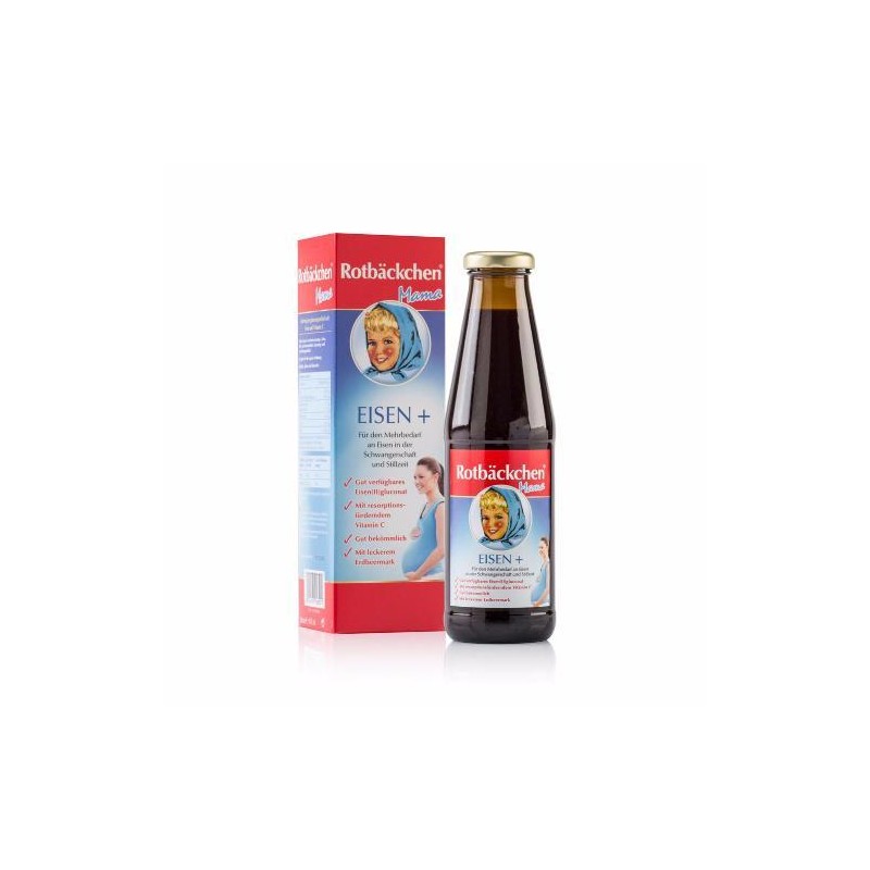 Rotbäckchen Mama Iron+ is an iron supplement based on natural ingredients. The dose-appropriate dosage helps to meet the additional requirements of iron during pregnancy (15 mg) and breast feeding (5 mg). Thus, fatigue and sluggishness are suggested. The vitamin C contained additionally stimulates the immune system. The restriction to a few ingredients reduces the allergen risk. Rotbäckchen Mama Iron+ is one of the most trusted and favoured iron formula of German mothers for many years.
