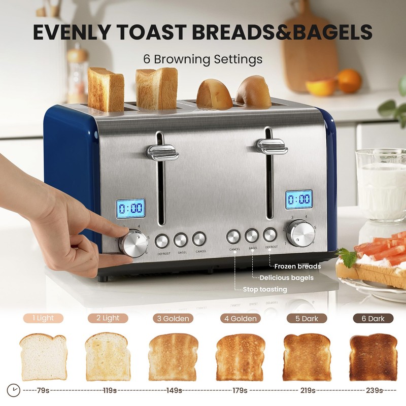 - LED Display Countdown Timer: Roter Mond toaster 4 slice equipped with LED countdown timer display, which exactly indicates the remaining time until your toast is ready. It helps you enjoy a more efficient toasting without waiting all the time