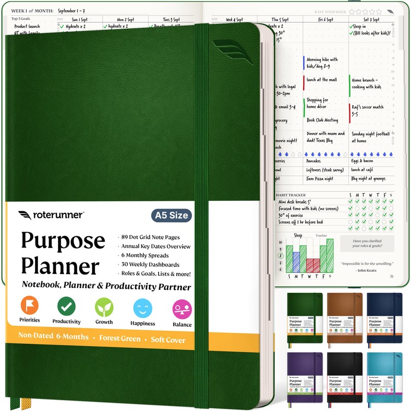 Roterunner Purpose Planner Notebook A5 5.8”x8.3” Undated Daily Planner 2024-2025 Daily Weekly and Monthly Productivity Goal Setting Tool for Work Home ADHD Planner for Adults Self Care Journal (Green