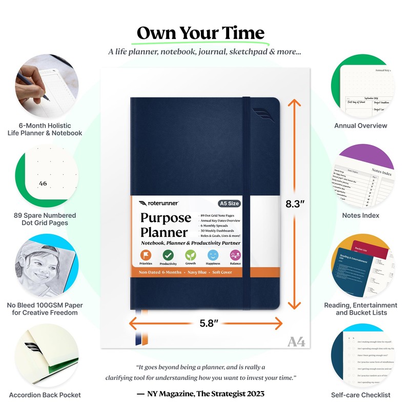 Roterunner Purpose Planner Notebook A5 5.8”x8.3” Undated Daily Planner 2024-2025 Daily Weekly and Monthly Productivity Goal Setting Tool for Work Home ADHD Planner for Adults Self Care Journal (Navy