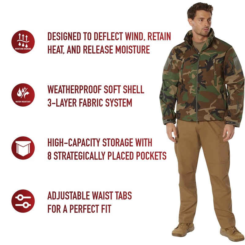 Rothco Special Ops Soft Shell Jacket - Unbeatable Weather Defense and Tactical Versatility, Woodland Camo, L