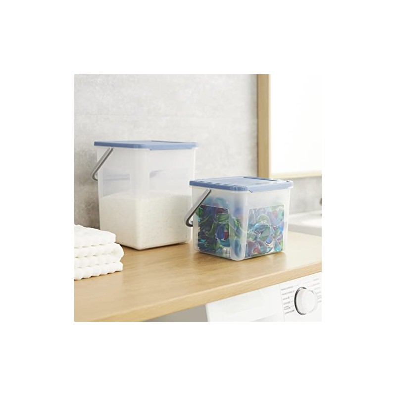 - Use: practical storage container offers space for up to 5 kg of detergent. Easy to refill and dispense thanks to the large lid opening. Several boxes can be easily stacked on the shelf