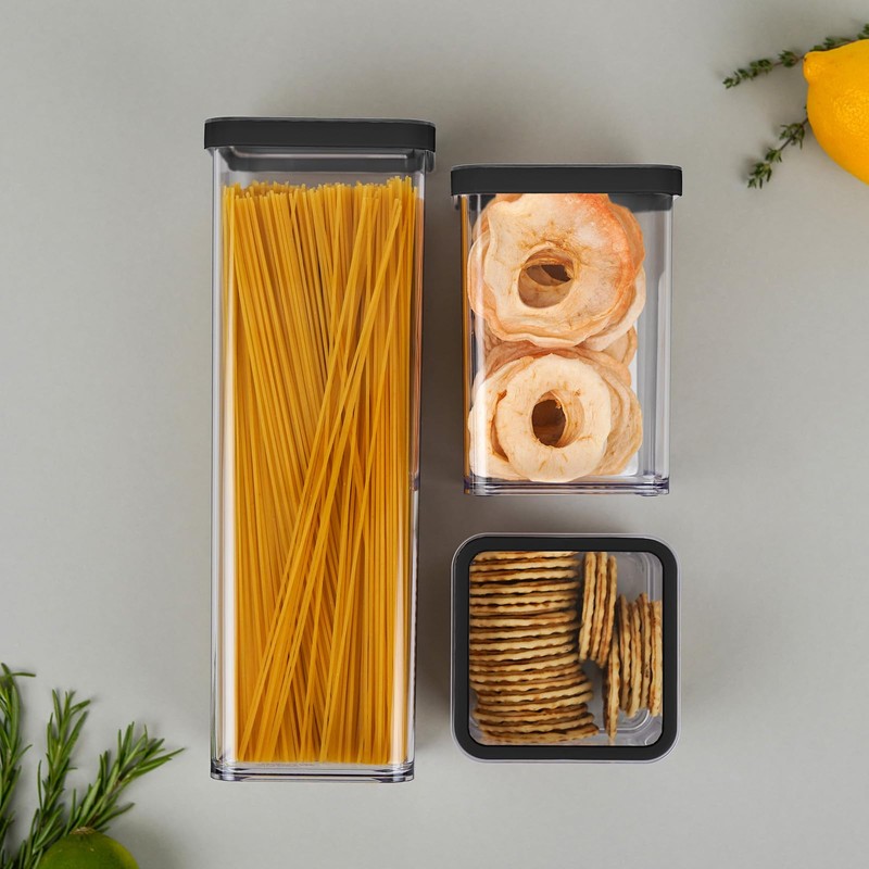 - Use: spacious food storage containers – no deformation or scratching of the storage boxes after cleaning in the dishwasher – e.g. storage of flour, sugar, cereal, pasta, coffee, baking accessories, etc.