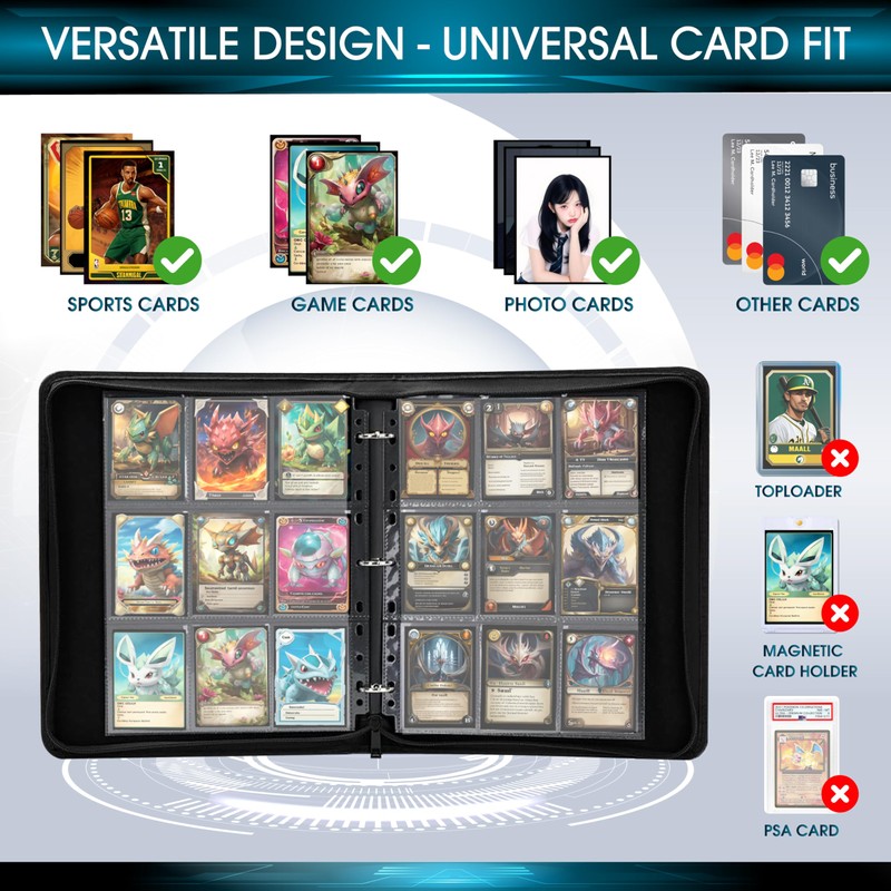 - ✅ LARGE CAPACITY & UNIVERSAL FIT - Includes 50 high-quality trading card sleeve pages, each with 9 double-sided pockets, offering 900 total slots for standard-sized cards (2.5" x 3.5"). Suitable for game cards, business cards and others