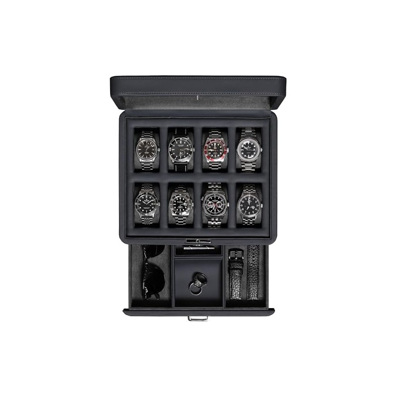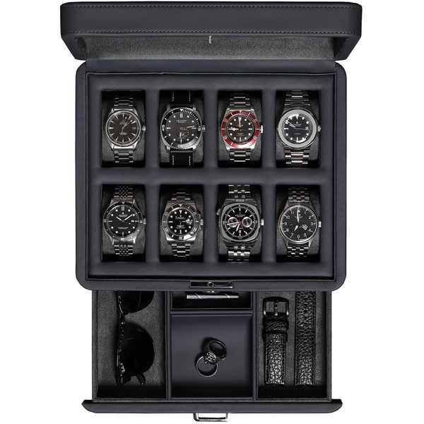 - VALET DRAWER: The slide-out accessory drawer is perfect for storing additional watches, watch straps, cufflinks, rings, tie clips, sunglasses, pens, money, cards, or watch tools. Maximize your storage options with this versatile and accessible feature.