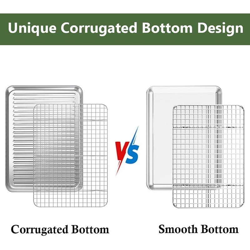 • Healthy Material The baking sheet with wire rack are made of high quality stainless steel without any chemical coating, wouldn't create chemicals at high-temperature baking, great replacement to aluminum pan, rust free and healthy for your daily use.