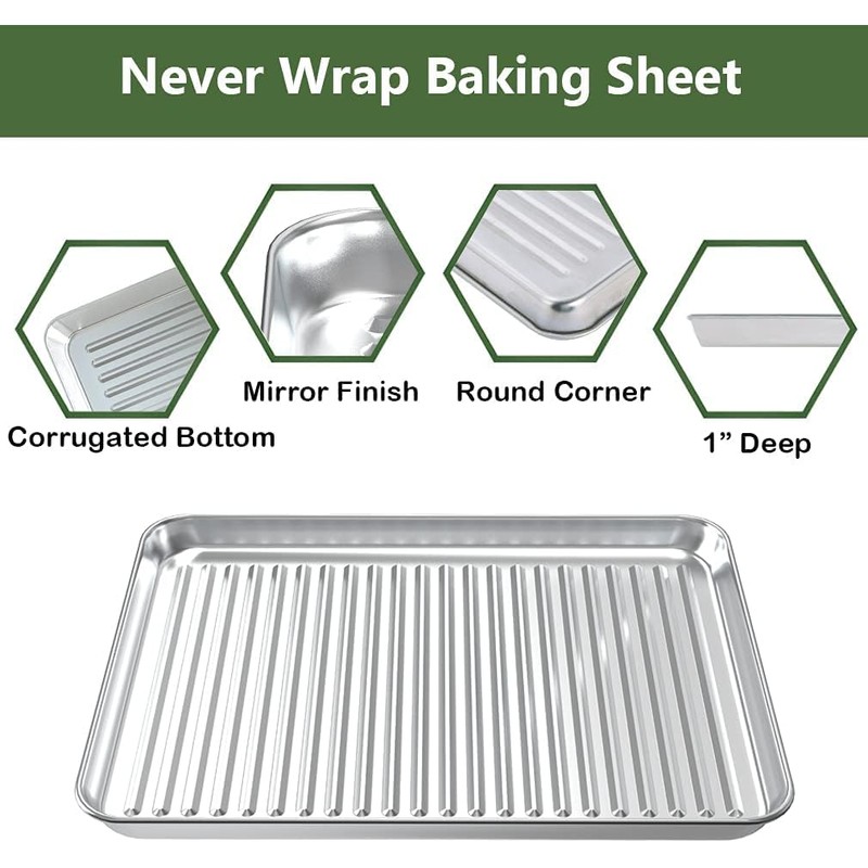 • Corrugated Surface Unique design with corrugated surface in the bottom of sheet pan, to reduce the risk of food sticking, facilitates air flow for quick release and even baking. This design also strengthen the structure to the pan for warp resistance.