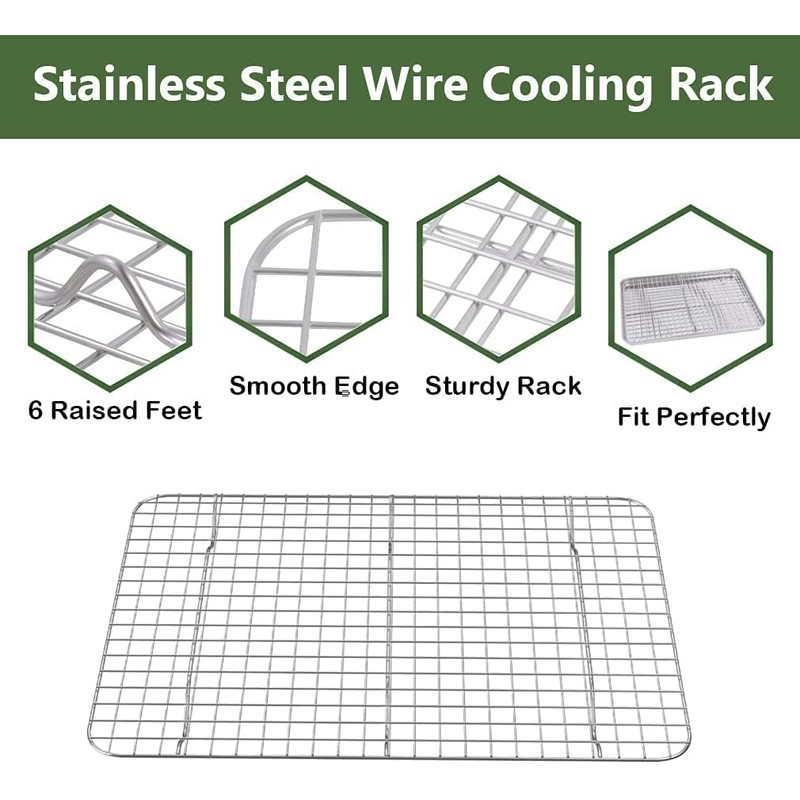• Cooling RackThe oven safe baking rack welded firmly with dense parallel lines to keep food from falling through. 6 raised feet for stability and uniform cooling, each wire rack is perfectly fits in the baking pan, that can also be used as a bacon rack for cooking crispy bacon.