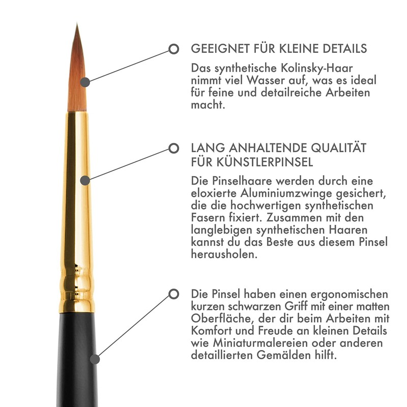 • Great for small details - The brushes have a black, ergonomic, short handle with a matte coating that allows you to work with comfort and pleasure on small details, such as miniatures or other small, detailed paintings. In addition, the synthetic Kolinsky hair absorbs plenty of water, making it ideal for subtle and detailed work