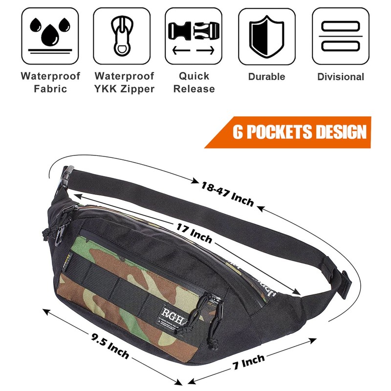 - Large Fanny Pack With Tactical Design : Classic black and camo military pattern with molle construction design which is perfect for hunting, hiking, running, camping, biking and other outdoor activities