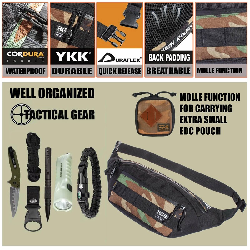- Top Quality Material and Trims: Rough Enough camo waist pack is made of 1000D CORDURA waterproof fabric and strong nylon inside lining with 2 ways YKK waterproof zippers closure, UTX D-FLEX buckles which is durable and sturdy in use for long lasting