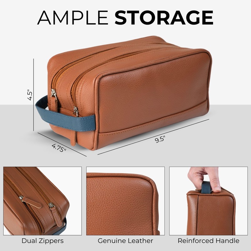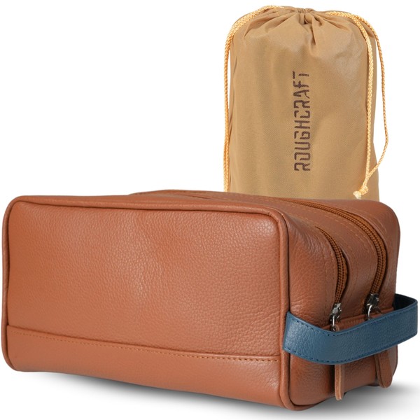 ROUGHCRAFT Fine Grain Leather Travel Toiltery Bag- Dopp Kit Travel Orangizer, (Large-Tan), Tan Brown, 11 inch double zipper toiletry bag, Double Zipper Compartment With Water Resistant Lining and