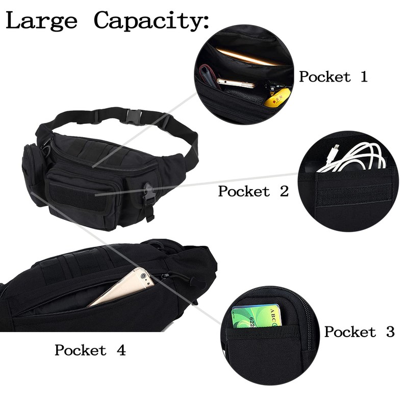 - MULTI-POCKET DESIGN: The Military Waist Bag has multiple pockets fully meet your basic outdoor needs.A main zipper pocket is big enough for carrying your tactical flashlight, kettle, cell phone, MP3, glasses, cigarette, snacks, umbrella etc. The zippered BACK POCKET is hidden for extra protection about your passport,,wallet ,ID card and essential stuffs. Three front pockets can be used to save your gadgets, small parts.
