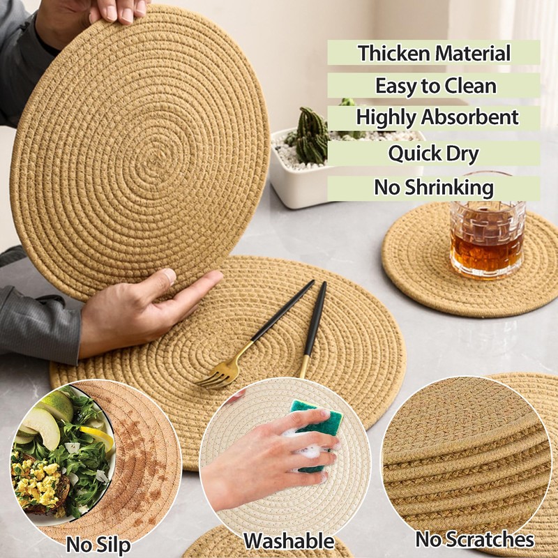 - FITS DIFFERENT SIZE PLATES: Round placemats are 11.8" in diameter and 0.3" in thickness. Non-slip, heat-resistant, and anti-scalding, also can be used as a trivet or hot pads for the kitchen. Fit for rectangular, round and oval tables.