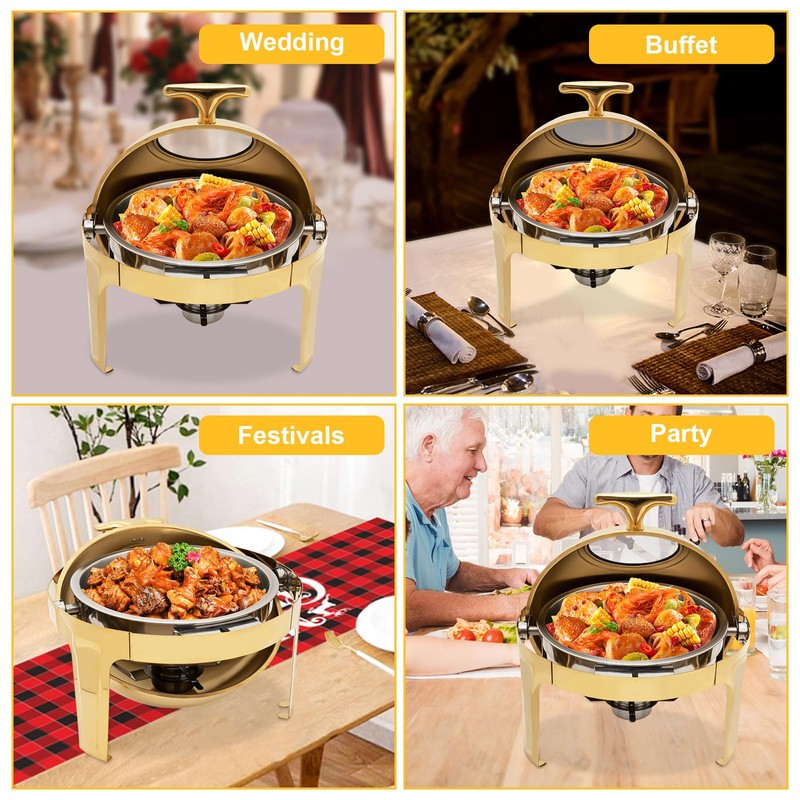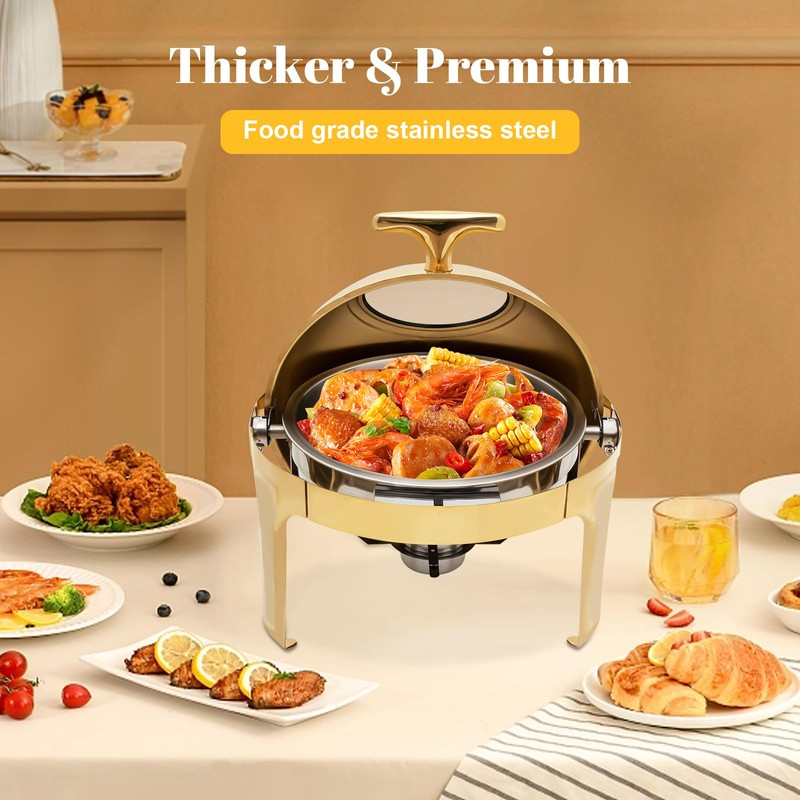 Round Chafing Dish Buffet Set 6.3 QT, Roll Top Stainless Steel Buffet Warmer Chafers with Food and Water Trays, Buffet Warmer Sets with Thick Frame for Catering Events Parties Weddings Dinners (Gold)
