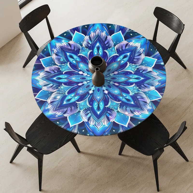 Round Fitted Tablecloth with Elastic Edged Boho Mandala Washable Polyester Table Cover for Outdoor Indoor Party Wedding Use - Fits Tables up to 40"-44" Diameter