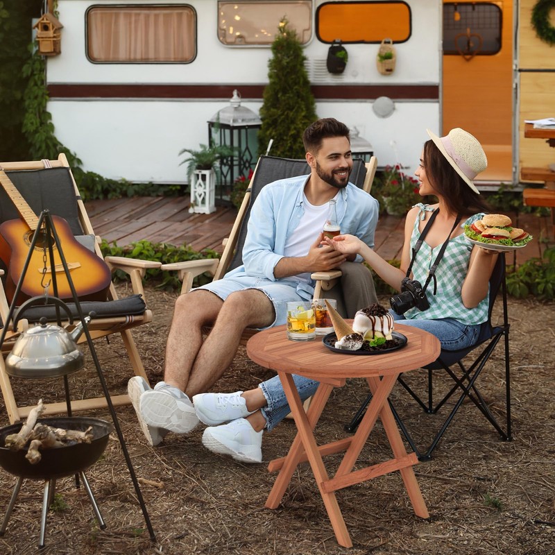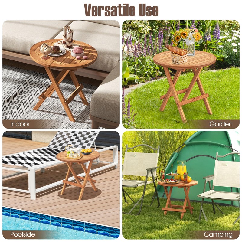 Transform your backyard with this folding patio side table! Crafted from premium teak wood, this folding table exudes a natural and sophisticated charm. The rich wooden texture brings warmth and elegance to any setting. Featuring a collapsible design, this table can easily be expanded for immediate use and conveniently stored away when not needed. The X-shaped frame and reinforced crossbars provide exceptional stability and ensure a sturdy weight capacity. Perfect for parks, backyards, gardens, and other outdoor spaces, this table is ideal for relaxation and entertaining!