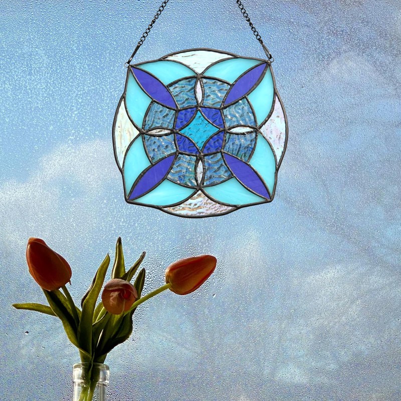Round Geometric Blue Stained Glass Window Hanging Panel Light Catcher Handmade Window Treatments