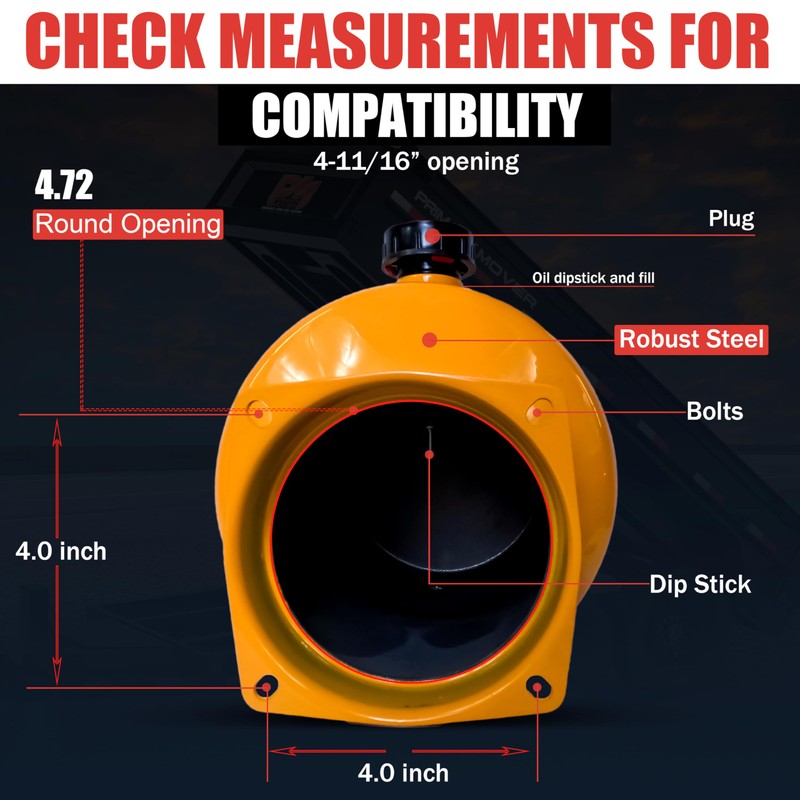 - Precision Measurements: The Primary Mover Steel Hydraulic Power Unit Reservoirs feature a 4-11/16" round opening and a 4" square bolt pattern, ensuring precise fitment and compatibility with a variety of hydraulic systems.