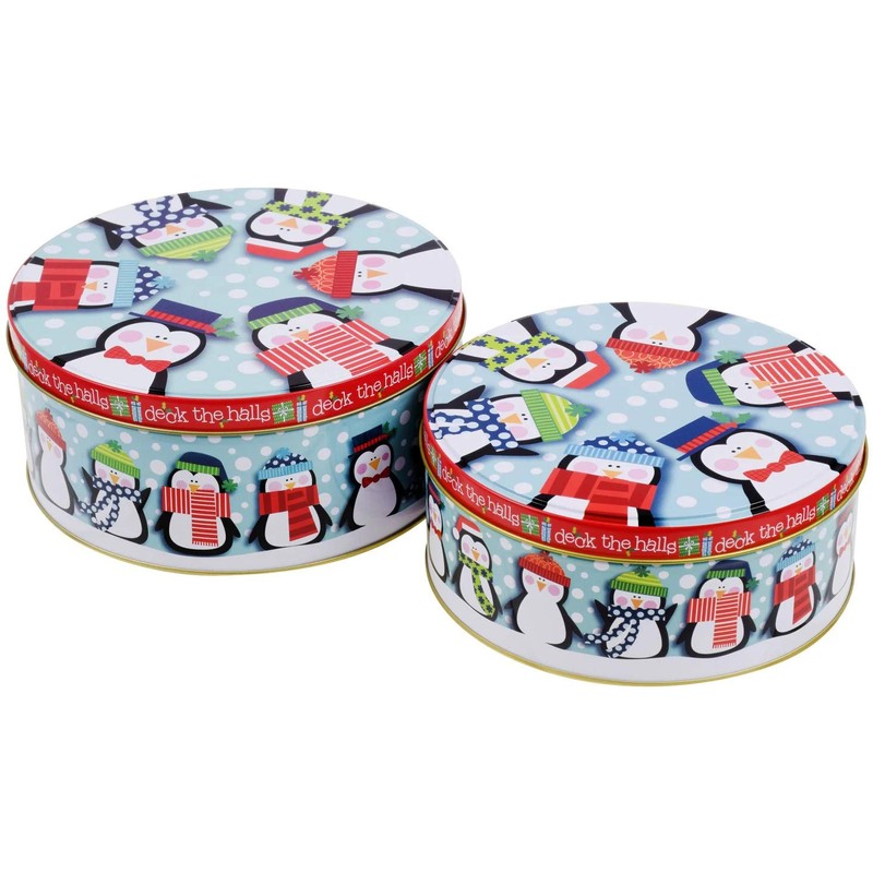 Round Nesting Tins With Holiday Print Designs Bundle of 2 Round Metal Tins with Lids for Cookies, Candy, Food Presents - 1- 6 and 3/4 Inches and 1- 6 inches Diameter
