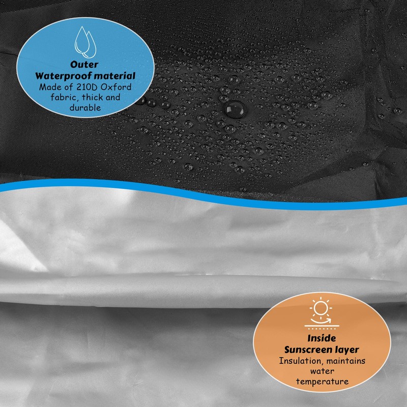 - Thick and robust Oxford fabric: the paddling pool cover is made of 210D painted silver material, tightly sewn, thick and robust, with excellent UV protection, waterproof, windproof and thermal insulation. It also reduces water loss due to evaporation, maintains the water temperature of the pool and saves water.