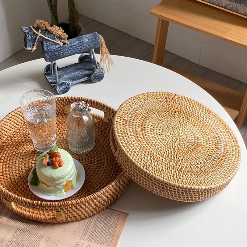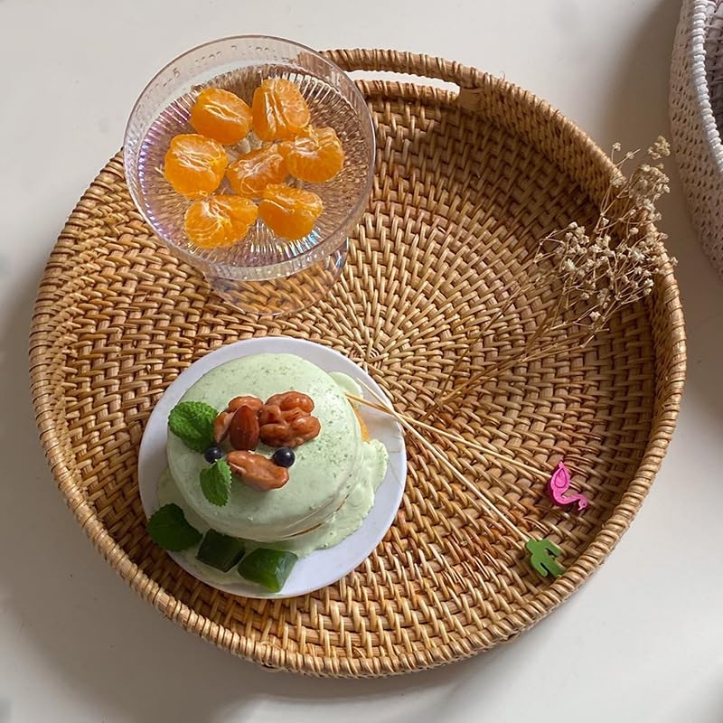Round Rattan Tray, Hand Woven Serving Tray with Handles, Wicker Serving Basket, Decorative Tray for Home Decor (Natural, Small)
